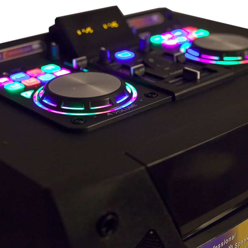 Δυνατό φορητό ηχείο με μίκτη και διπλό Bluetooth με ισχύ 400W και LED φωτισμό. Είναι ένας μοναδικός συνδυασμός ηχείου και μίκτη με δυνατότητα σύνδεσης ενσύρματων και ασύρματων μικροφώνων. Γίνεται το κέντρο πάρτι! Συνδέεται με δύο πηγές ήχου, τις οποίες μπορείτε να ελέγξετε ξεχωριστά, μέσω Bluetooth, AUX-IN, USB, κάρτας SD, ραδιοφώνου ή ενσύρματου μικροφώνου και με τον ενσωματωμένο μίκτη μπορείτε να παίξετε μουσική όπως οι επαγγελματίες. Το ηχείο είναι αρκετό δυνατό για εσωτερικούς και εξωτερικούς χώρους και παράγει καθαρό ήχο σε όλες τις εντάσεις. To κάθε ηχείο είναι 15inc. Διαθέτει χερούλια και ροδάκια για ευκολία στη μεταφορά. Διαθέτει δυο υποδοχές 6,5 mm για σύνδεση ενσύρματων μικροφώνων, USB, είσοδο SD card και είσοδο AUX-IN για να συνδέσετε οποιαδήποτε πηγή ήχου έχει υποδοχή για ακουστικά 3.5mm jack, όπως smartphone, laptop και tablet. Όλες του οι δυνατότητες ελέγχονται από το τηλεχειριστήριο εύκολα και γρήγορα. Οι δυνατότητες διασύνδεσης και ο δυνατός και καθαρός ήχος το κάνουν ιδανικό για καθημερινή χρήση. Οι δυνατότητές του το κάνουν ιδανικό για καραόκε, μουσικούς που χρειάζονται ενισχυτή και όσους ψάχνουν άριστη ποιότητα ήχου. Μπορείτε να ρυθμίσετε ξεχωριστά την ένταση των δυο εισόδων ήχου και διαθέτει ρόδα για να βρίσκετε εύκολα το σημείο μέσα στο τραγούδι που θέλετε να μιξάρετε. Τέλος διαθέτει και ραδιόφωνο FM με αυτόματο σκανάρισμα σταθμών.