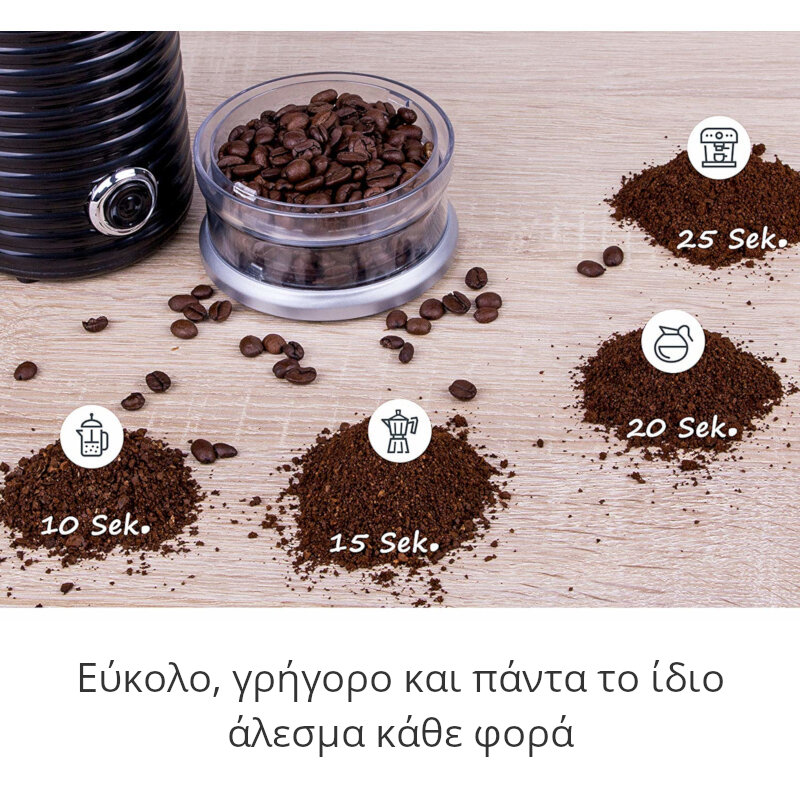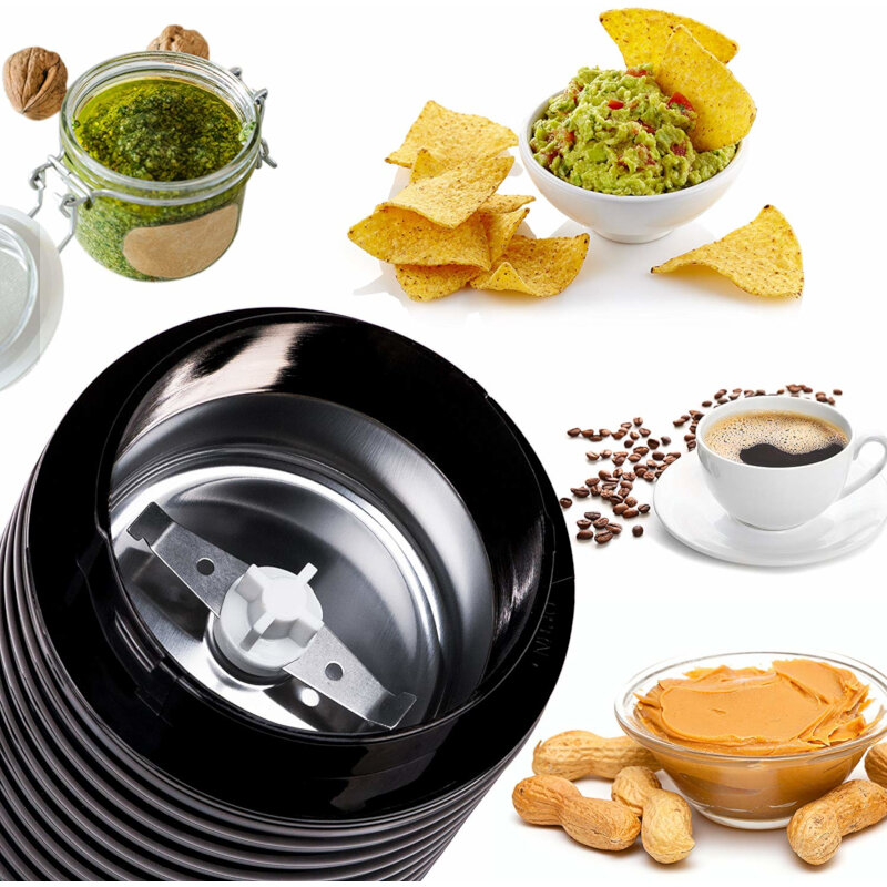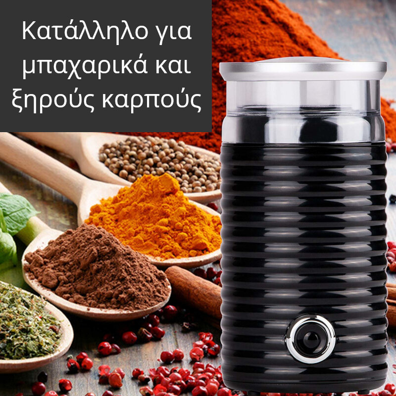 Μύλος καφέ και μπαχαρικών 160W. Για να έχετε φρεσκοκομμένο καφέ, μπαχαρικά, ξηρούς καρπούς, τσάι, βότανα και άλλα. Λεπίδες από ανοξείδωτο ατσάλι, χωρητικότητα 65 γρ. και λειτουργία με ένα χέρι.